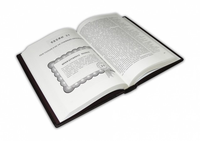Французька обкладинка ручної роботи виконана з натуральної італійської шкіри теля «Bordo». Обкладинка книги оформлена рельєфним «золотим» тисненням та об'ємними візерунками ручного тиснення. Обріз вручну полірований і позолочений сусальним золотом.