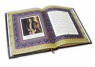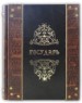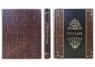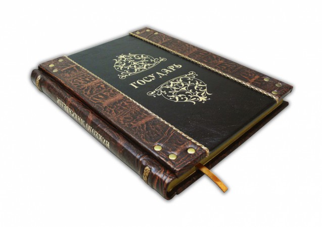 Французька обкладинка ручної роботи виконана з комбінації натуральних шкір (шкіра «Plonge Brown», шкіра «Coccodrillo» виробництва італійської шкіряної фабрики «Claudio»). Обкладинка книги дворівнева, оформлена рельєфним золотим тисненням (фольга Luxor 240), вставками з плетеного шкіряного шпагату (колір Bronze), латунними холітенами, кількістю 12 шт. Обріз полірований та позолочений вручну сусальним золотом.