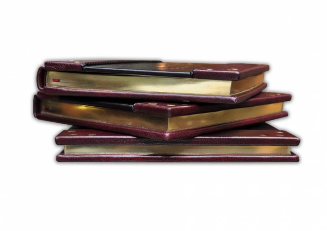 Французька складова палітурка ручної роботи виконана з комбінації натуральних шкір (шкіра «Marma Rossa», шкіра «Plonge Brown» виробництва італійської шкіряної фабрики «Claudio»). Обкладинки книг оформлені рельєфним золотим тисненням, латунними холітенами (колір "Gold", кількість 12 штук), плетеним шкіряним шпагатом. Обріз блоку вручну полірований та позолочений сусальним золотом.