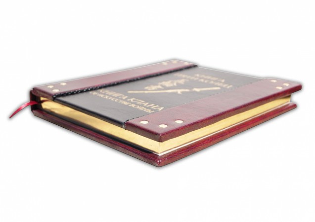 Французька складова палітурка ручної роботи виконана з комбінації натуральних шкір (шкіра «Marma Rossa»; шкіра «Plonge Brown» виробництва італійської шкіряної фабрики «Claudio»). Обкладинка книги оформлена рельєфним золотим тисненням, латунними холітенами (колір "Gold" кількість 12 штук), плетеним шкіряним шпагатом.