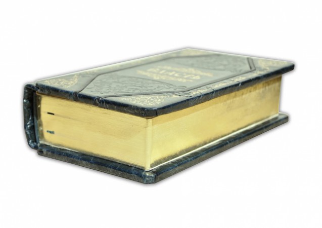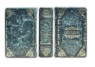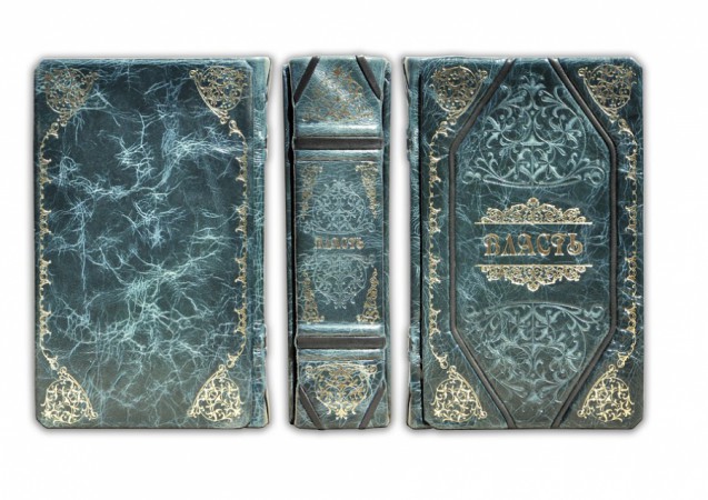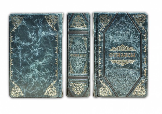 Французька складова палітурка ручної роботи виконана з комбінації натуральних шкір (шкіра «Mare azzuro», шкіра «Vetro grigio» виробництва італійської шкіряної фабрики «Benericetti»). Обкладинка книг та футляр-ложемент оформлені багаторівневим тисненням - глибоким блинтовим та рельєфним золотим, з використанням фольги «Luxor 240», внутрішнє оздоблення футляра встелене парчою. Обріз книг вручну полірований і позолочений сусальним золотом.