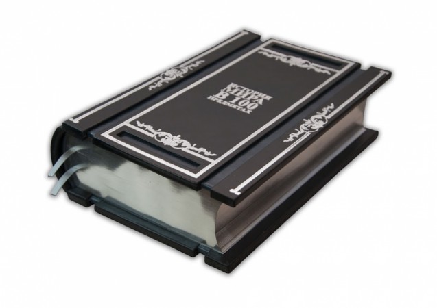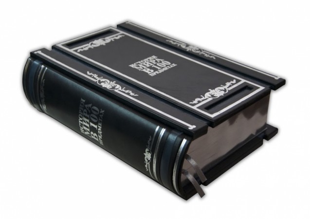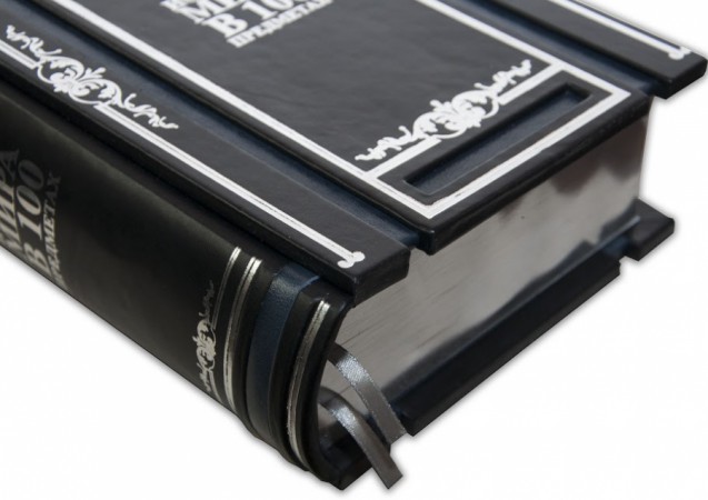 Французька складова палітурка ручної роботи виконана з комбінації натуральної шкіри (шкіра теля «Nero Zegna», шкіра «Robbat Blue» виробництва італійської шкіряної фабрики «Carisma»). Обкладинка книги унікальної дворівневої архітектури оформлена срібним рельєфним тисненням з використанням фольги «Luxor 240». Обріз книги вручну полірований і срібний сусальним сріблом.