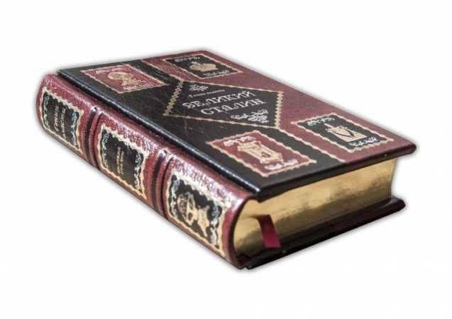 Французька складова палітурка ручної роботи виконана з комбінації натуральних шкір (шкіра «Plonge Brown», шкіра «Marma Rossa» виробництва італійської шкіряної фабрики «Claudio»). Обкладинка книги оформлена комбінацією рельєфного золотого та срібного тиснення з використанням фольги «Luxor 240». Обріз блоку вручну полірований та позолочений сусальним золотом.