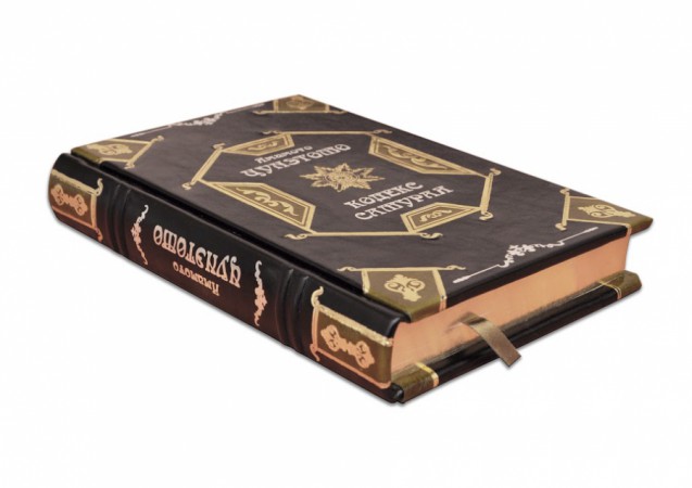 Французька складова палітурка ручної роботи виконана з комбінації натуральних шкір (шкіра «Robbat nero», шкіра «Robbat verde» виробництва італійської шкіряної фабрики «Carisma»). Обкладинка книги оформлена комбінацією рельєфного золотого та срібного тиснення з використанням фольги «Luxor 240». Обріз блоку вручну полірований та позолочений сусальним золотом.