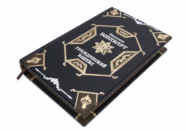 Французька складова палітурка ручної роботи виконана з комбінації натуральних шкір (шкіра «Robbat nero», шкіра «Robbat verde» виробництва італійської шкіряної фабрики «Carisma»). Обкладинка книги оформлена комбінацією рельєфного золотого та срібного тиснення з використанням фольги «Luxor 240». Обріз блоку вручну полірований та позолочений сусальним золотом.