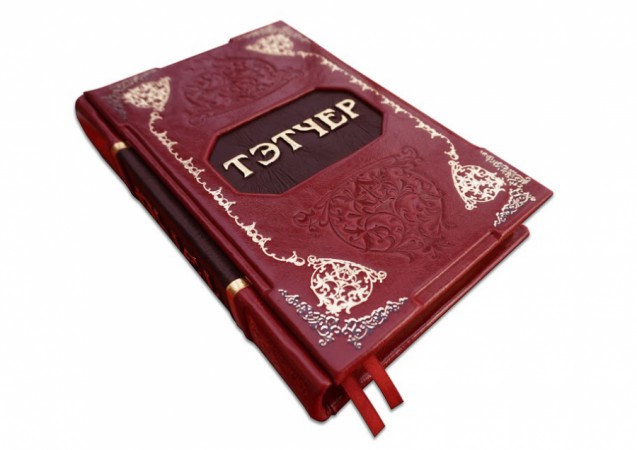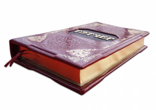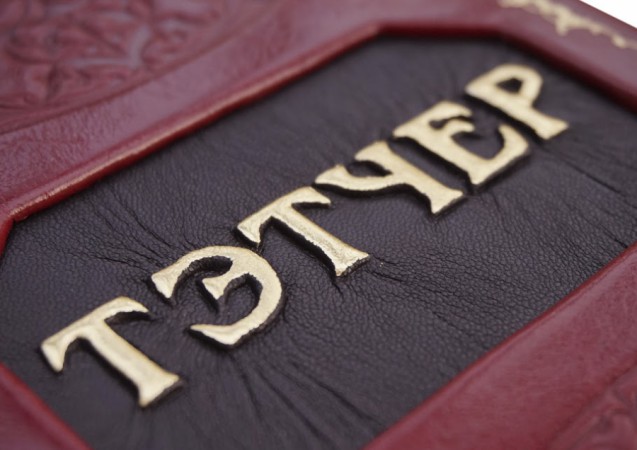 вставками з козячої шкіри «Grande oro», виробництва італійської шкіряної фабрики «Claudio»). Обкладинка книги оформлена глибоким