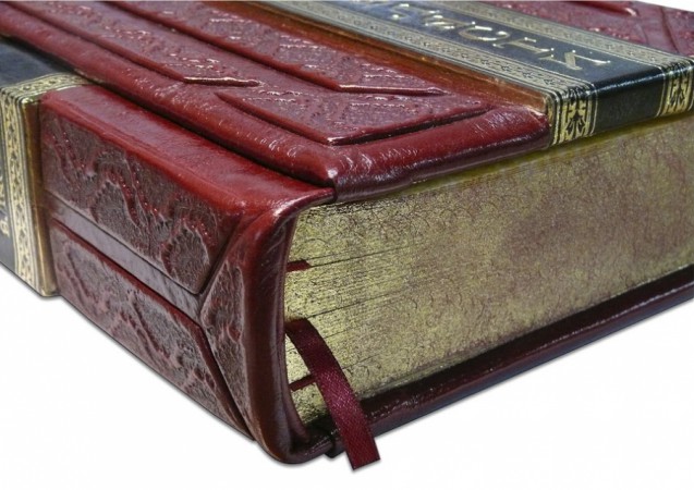 nero» виробництва італійської шкіряної фабрики Carisma»). Обкладинка книги оформлена комбінацією багаторівневого об'ємного тиснення: рельєфного золотого з використанням фольги «Luxor 240» та глибокого блінтового. Обріз вручну полірований і позолочений сусальним золотом.