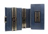 Французька складова палітурка ручної роботи виконана з комбінації натуральних шкір (шкіра теля «Robbat blue», шкіра «Robbat nero» виробництва італійської шкіряної фабрики Carisma»). Обкладинка книг оформлена комбінацією багаторівневого об'ємного тиснення: рельєфного золотого з використанням фольги «Luxor 240» та глибокого блінтового. Обрізи вручну поліровані та позолочені сусальним золотом. Внутрішнє оздоблення футляра вистелене італійським коттон-оксамитом.
