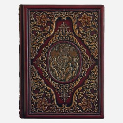 Французька складова палітурка ручної роботи виконана з комбінації натуральних шкір (шкіра «Plonge Brown», шкіра «Marma Rossa» виробництва італійської шкіряної фабрики «Claudio»). Обкладинка книги оформлена комбінацією рельєфного золотого та срібного тиснення з використанням фольги «Luxor 240». Обріз блоку вручну полірований та позолочений сусальним золотом.