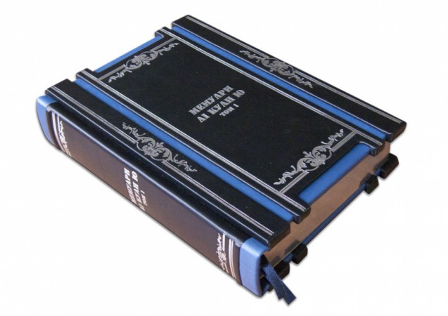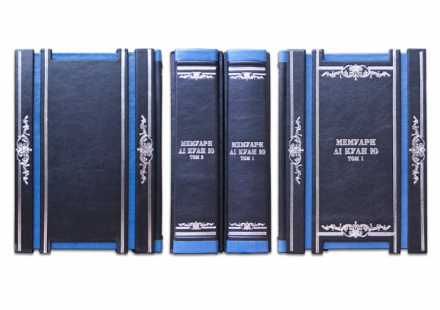 Французькі складові палітурки ручної роботи виконані з комбінації натуральної шкіри (шкіра Nero Zegna, шкіра Robbat Blue виробництва італійської фабрики Carisma). Обкладинки книг унікальної дворівневої архітектури прикрашені рельєфним срібним тисненням із використанням фольги «Luxor 240». Обрізи вручну поліровані та посріблені сусальним сріблом.