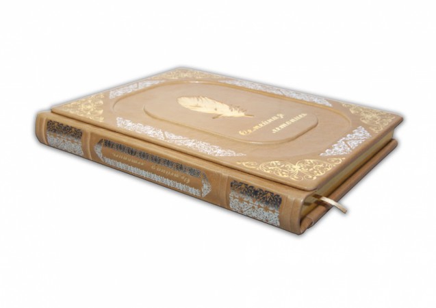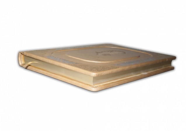 фабрики «Claudio». Обкладинка книги дворівнева, декорована комбінацією рельєфного тиснення, з використанням золотої та срібної фольги "Luxor 240". Обріз вручну полірований і позолочений сусальним золотом.