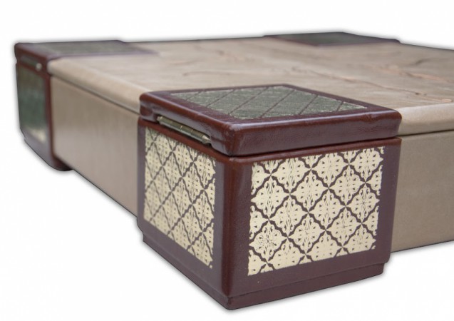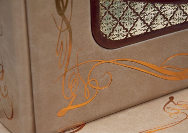 виробництва італійської шкіряної фабрики «Claudio»). Обкладинка книги та футляр дворівневі, оформлені комбінацією золотого та червоного тиснення. Авторський футляр-попітюр, виготовлений повністю вручну, є органічним доповненням альбому, покликаний максимально посилювати ефект подарункового комплекту.