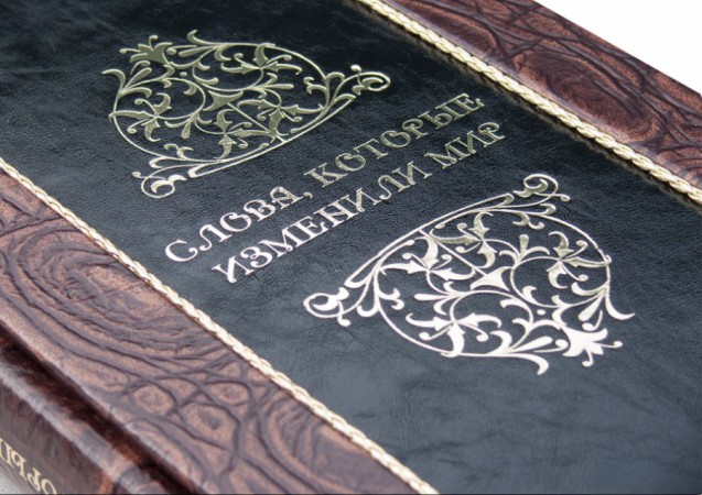 Французька складова палітурка ручної роботи, виконана з комбінації натуральних шкір (шкіра «PlongeBrown», шкіра «Bronzodinosauro» виробництва італійської шкіряної фабрики «Claudio». Обкладинка книги дворівнева оформлена рельєфним золотим тисненням (фольга «Luxor 240»). шкіряного шпагату (колір «Bronze»), латунними холітенами, кількістю 4 шт., Обріз вручну полірований і позолочений (колір «Bronze»)