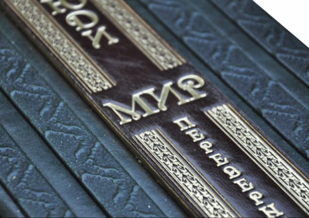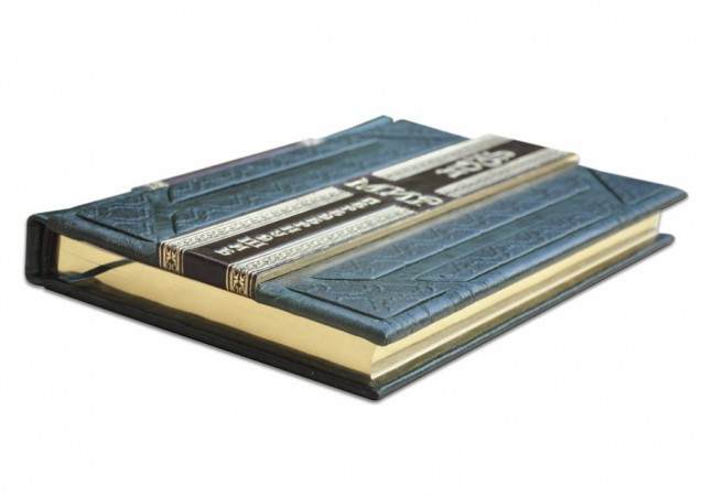 Французька складова палітурка ручної роботи виконана з комбінації натуральної шкіри (шкіра теля «Robbat Wisky», шкіра «Smeraldo scuro» виробництва італійської шкіряної фабрики Carisma»). Обкладинка книги оформлена комбінацією багаторівневого об'ємного тиснення: рельєфного золотого з використанням фольги «Luxor 240» та глибокого блінтового. Обріз вручну полірований і позолочений сусальним золотом.