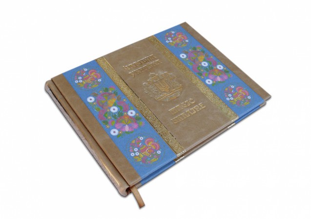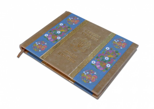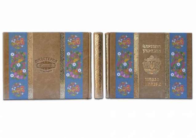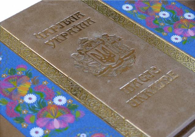 Французька складова палітурка ручної роботи виконана з натуральної шкіри Rabbat parle, виробництва італійської фабрики Carisma. Обкладинка книги дворівнева, прикрашена вставками з полотна, багаторівневим тисненням: глибоким блінтовим та рельєфним золотим, з фольгою «Luxor 240». Обріз вручну полірованих і позолочені сусальним золотом.
