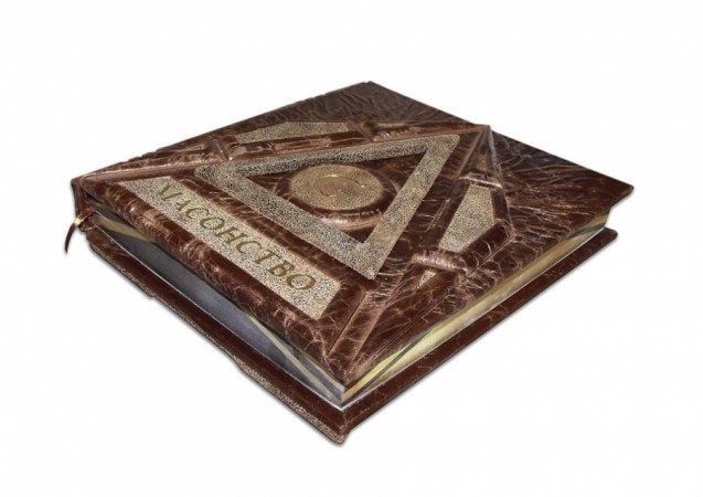 Французька складова палітурка ручної роботи виконана з комбінації натуральної шкіри (шкіра «Vetro marrone vernice», шкіра «Pistacchio» виробництва італійської шкіряної фабрики «Carisma»). Обкладинка книги унікальної авторської архітектури оформлена високим рельєфом, декорована золотим тисненням (використано фольгу «Luxor 240»). Обріз книги вручну полірований та декорований комбінацією сусального золота та чорної фольги.