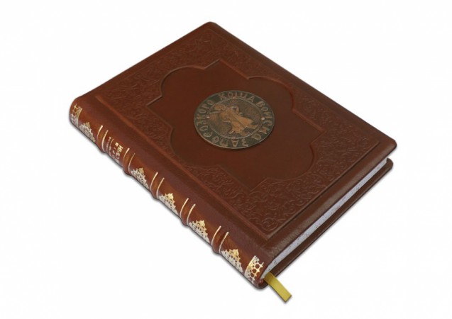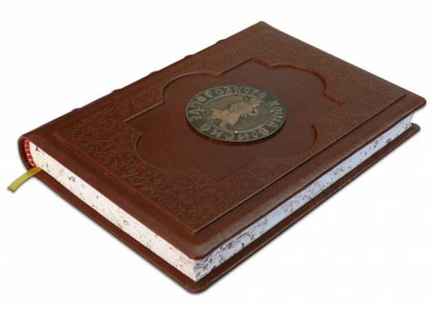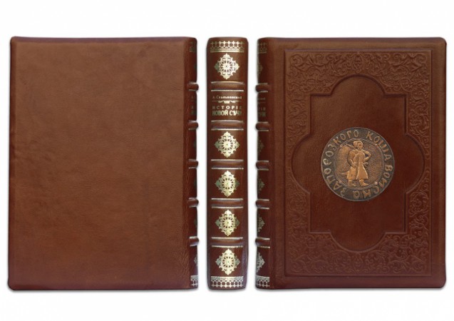фабрики «Carisma». Обкладинка книги дворівнева, декорована об'ємним барельєфом «Козак», рельєфним тисненням: глибоким блінтовим та рельєфним золотим (використано фольгу «Luxor 240»). Обріз пофарбований вручну.
