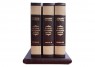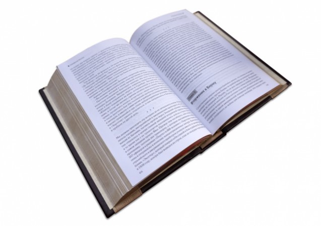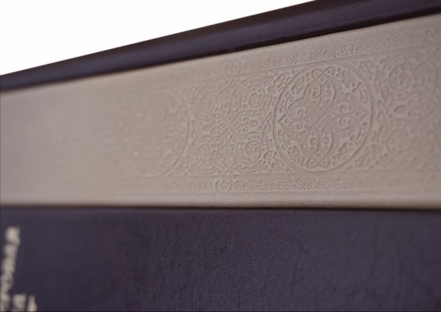 виробництва італійської шкіряної фабрики «Claudio»). Обкладинки книг та футляр оформлені багаторівневим тисненням: комбінацією рельєфного золотого та срібного тиснення з використанням фольги «Luxor 240». Корінець круглений з натуральними бинтами. Шкіряний каптал та шовкові стрічки-лясі. Обріз книг вручну полірований і позолочений сусальним золотом. Футляр вистелений італійським коттон-оксамитом.