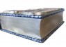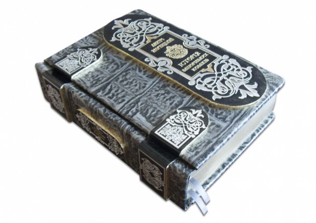 Французька шкіряна палітурка книги ручної роботи виконана з комбінації натуральної шкіри (шкіра «Argento dinosauro», шкіра «Robbat nero» виробництва італійської фабрики «Carisma»). Дворівнева обкладинка книги, прикрашена рельєфним золотим і срібним тисненням, з використанням фольги «Luxor 240». Обріз книги вручну полірований та позолочений сусальним золотом.