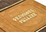 Французька складова палітурка ручної роботи виконана з комбінації натуральної замші та нубуку. Дворівнева обкладинка книги, виготовлена в авторській технології високого рельєфу, декорована комбінацією глибокого блінтового і рельєфного золотого тиснення, з використанням фольги «Luxor 240». Обріз блоку вручну полірований та позолочений сусальним золотом.
