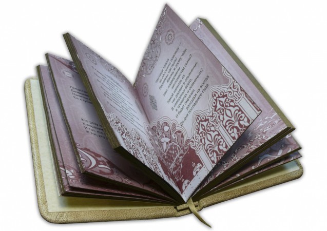 фабрики «Claudio». Обкладинка книги оформлена багаторівневим тисненням: глибоким блінтовим та рельєфним золотим, із використанням золотої фольги «Luxor 240». Обріз полірований і позолочений сусальним золотом.