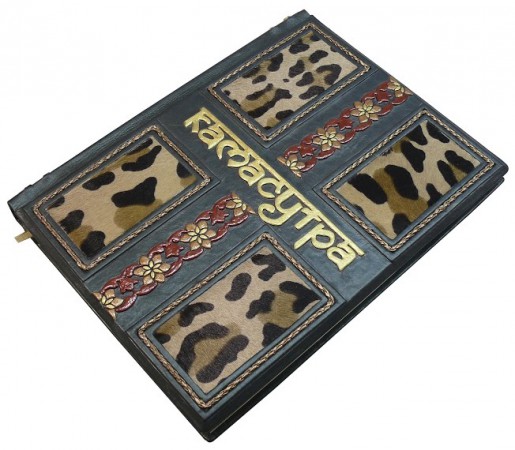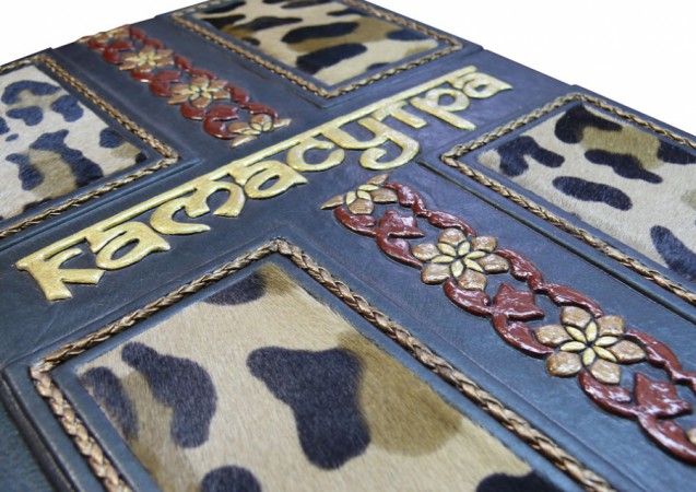 поні «Dolmen leopardo» виробництва італійської шкіряної фабрики «Carisma». Обкладинка книги оформлена унікальною авторською технікою «Розпис за об'ємними візерунками», вставками зі шкіряного шпагату ручного плетіння. Обріз книги вручну полірований і позолочений, колір Bronze.