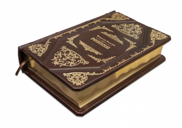 фабрики «Carisma». Обкладинка книги декорована комбінацією рельєфного блінтового та золотого тиснення (використано фольгу «Luxor 240»). Обріз книги вручну полірований та позолочений сусальним золотом.