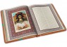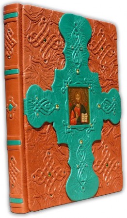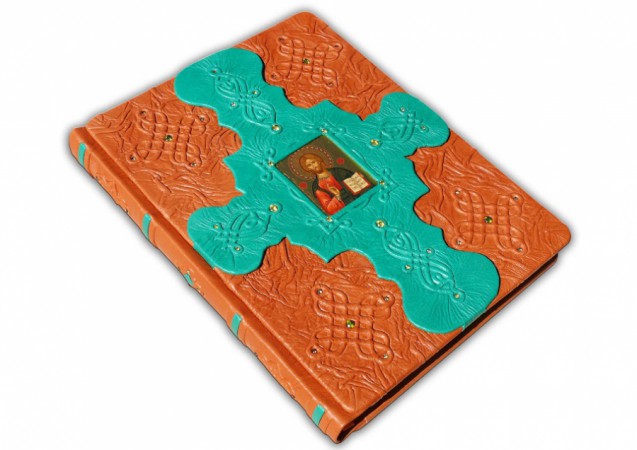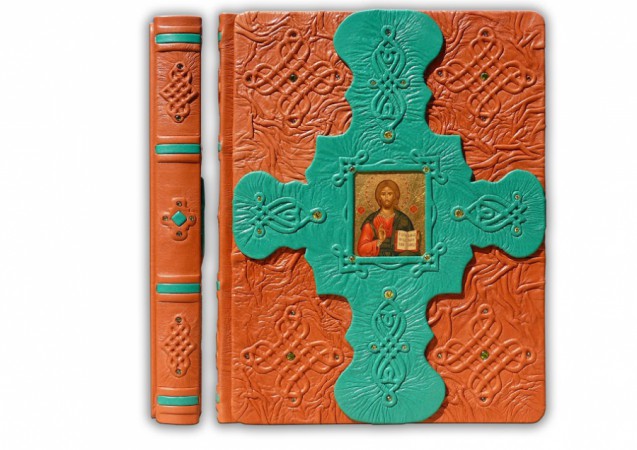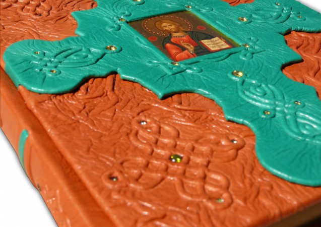 «Verde brillante» виробництва італійської шкіряної фабрики «Carisma»). Обкладинка книги оформлена об'ємними візерунками ручного тиснення, в обрамленні об'ємної пом'ятості, з інкрустацією камінням циркон діамантового огранювання, колір «цитрин» (3 мм. – 14 штук, 5 мм. – 4 штуки), колір «олива» (3 мм. – 24) штук, 5 мм – 4 штук). По центру обкладинки розміщено писану ікону. Обріз книги вручну полірований і позолочений, колір Bronze.