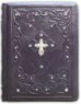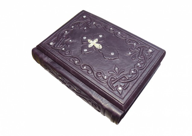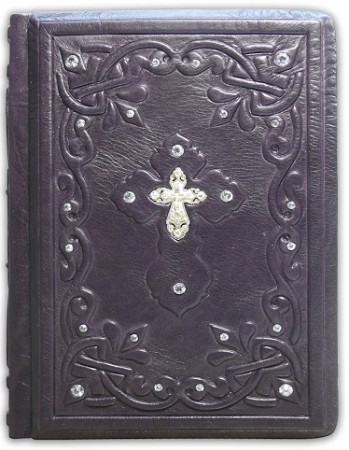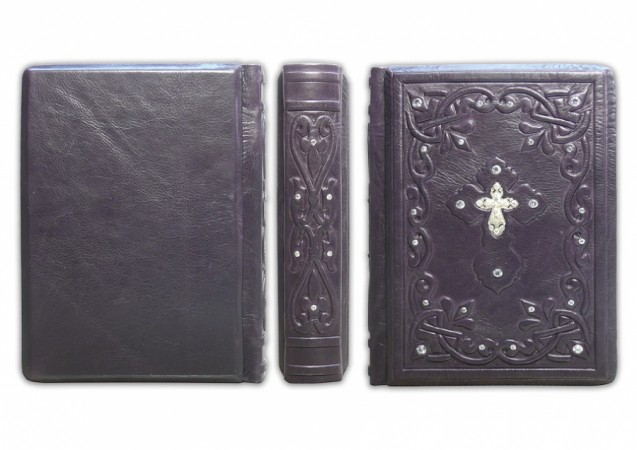 Французька складова палітурка ручної роботи виконана з натуральної італійської шкіри теля «Melanzana» виробництва італійської шкіряної фабрики «Motta Alfredo». Обкладинка книги оформлена об'ємними візерунками ручного тиснення, інкрустована камінням циркон діамантового огранювання (вищий сорт, виробництва компанії «Signity»), діаметром 5 мм. - Кількість 8 шт., Діаметром 3 мм. -