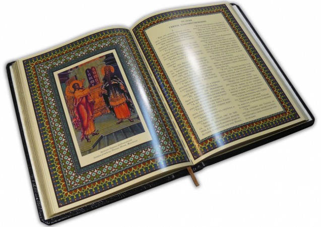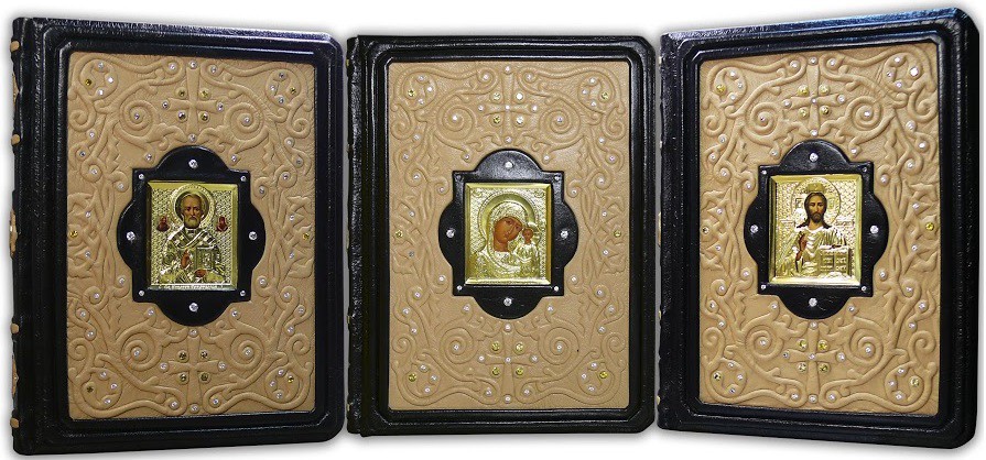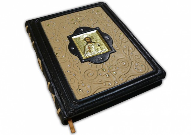 тиснення". Інкрустована камінням циркон, діамантового огранювання, виробництва компанії Swarovski: колір шампань, діаметр 5 мм., кількість 42 шт.; прозорі, діаметр 5 мм., кількість 12 шт., Діаметр 3 мм. кількість 198 шт., Діаметр 1,5 мм., 6 шт., іконами 6 шт. Обріз книги вручну полірований та позолочений сусальним золотом.