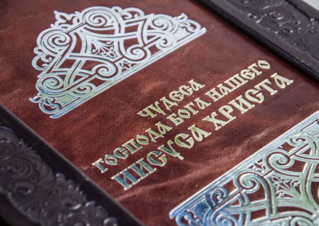 Французька складова палітурка ручної роботи виконана з комбінації натуральних шкір (шкіра «Robbat marone», шкіра «Robbat cognac» виробництва італійської шкіряної фабрики «Benericetti»). Обкладинка книги дворівнева, оформлена багаторівневим тисненням: рельєфним золотим та срібним (використано фольгу «Luxor 240»), глибоким блінтовим. Обріз блоку вручну полірований та позолочений сусальним золотом.