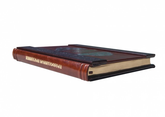 Французька складова палітурка ручної роботи виконана з комбінації натуральних шкір (шкіра «Robbat marone», шкіра «Robbat cognac» виробництва італійської шкіряної фабрики «Benericetti»). Обкладинка книги дворівнева, оформлена багаторівневим тисненням: рельєфним золотим та срібним (використано фольгу «Luxor 240»), глибоким блінтовим. Обріз блоку вручну полірований та позолочений сусальним золотом.