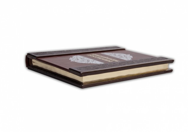 Французька складова палітурка ручної роботи виконана з комбінації натуральної шкіри (шкіра «Robbat marone», шкіра «Robbat cognac» виробництва італійської шкіряної фабрики «Benericetti»). Дворівнева обкладинка книги оформлена багаторівневим тисненням: рельєфним золотим і срібним (використано фольгу «Luxor 240»), глибоким блінтовим. Обріз блоку вручну полірований та позолочений сусальним золотом.