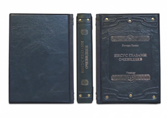 Французька складова палітурка ручної роботи виконана з натуральної шкіри теля «Onda del mare» виробництва італійської шкіряної фабрики «Carisma». Обкладинка книги оформлена рельєфним срібним тисненням із використанням фольги «Luxor 240», холітенами, 10 шт. Обріз книги вручну полірований та позолочений сусальним золотом.