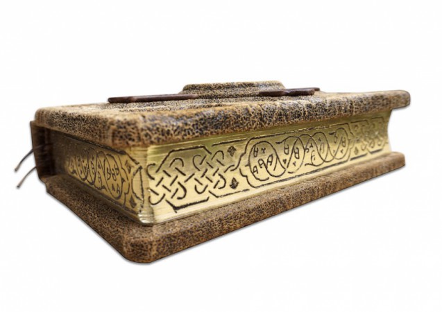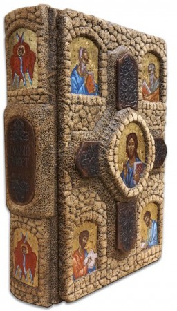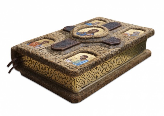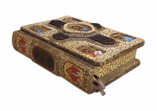 Основа багаторівневої обкладинки виготовлена в традиціях французької палітурки XVIII століття з натуральних матеріалів (голландський палітурний картон, італійська шкіра вищого ґатунку). Книга виконана в кількох техніках оформлення: техніка «кам'яна кладка» (повністю ручна робота), «гаряче блинтове» тиснення, ікони ручного розпису, шкіряний каптал, форзац із репродукції на полотні, Обріз книги поєднав гравірування та золочення.