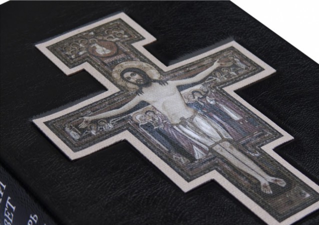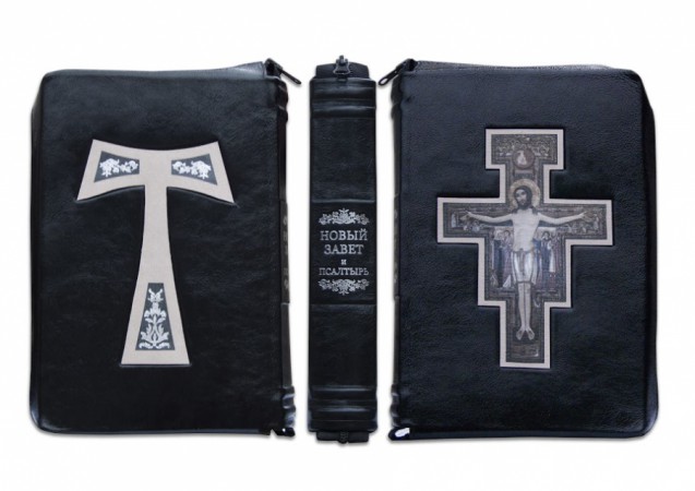 Французька цільношкіряна напівжорстка обкладинка ручної роботи виготовлена з натуральної шкіри «Robbat Nero» виробництва італійської шкіряної фабрики «Carisma». Обкладинка книги оформлена репродукцією на полотні The San Damiano Cross, декорована срібним тисненням, використана фольга Luxor 240, застібається на блискавку. Обріз книги вручну полірований і срібний сусальним сріблом.