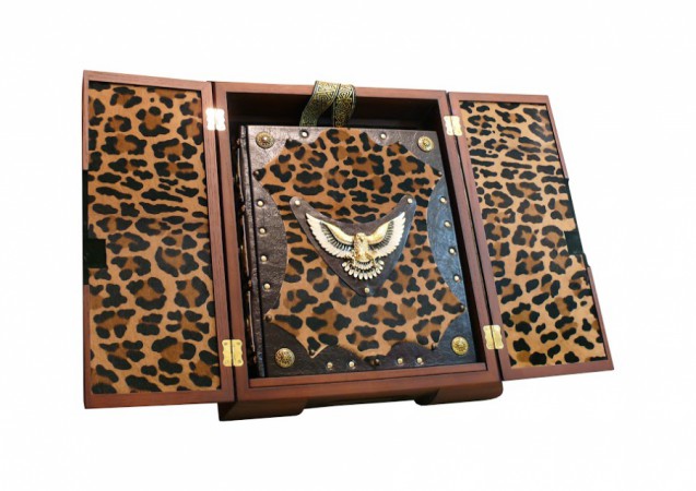 Французька складова палітурка ручної роботи виконана з комбінації натуральної шкіри «Plonge Braun» та шкіри поні «Luce leopardo» виробництва італійської шкіряної фабрики «Claudio». Обкладинка книги оформлена латунними та мідними холітенами, загальна кількість 47 штук, фурнітурою "Ferre", кількість 7 штук, художнім литтям "Орел", інкрустацією камінням циркон. Обріз блоку вручну полірований та позолочений сусальним золотом. Подарунковий футляр-підставка, виготовлений з натурального дуба та шкіри. Унікальна конструкція дозволяє трансформувати його в підставку для вигіднішого ракурсу книги.