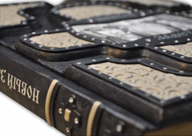 Французька складова палітурка ручної роботи виготовлена з комбінації натуральних шкір (шкіра теля «Vitellonero», овчина «Pelledipecoradelloro» виробництва італійської шкіряної фабрики «MottaAlfredo»). Обкладинка книги дворівнева, оформлена об'ємними візерунками ручного тиснення, рельєфною пом'ятістю шкіри, інкрустацією камінням циркон діамантового огранювання (діаметр 3,25 мм, кількістю 214 шт., діаметр 5 мм, кількість 4 шт., виробництво компанії «Signity»), виробництво компанії «Signity») полотні "TheLastSupper". Обріз книги ручну полірований і позолочений (колір "Bronze"). Подарунковий футляр із натуральної шкіри «PlongeBrown» (виробництво італійської шкіряної фабрики «Claudio»), оформлений репродукцією гравюри на полотні «TheDumbManPossessed».