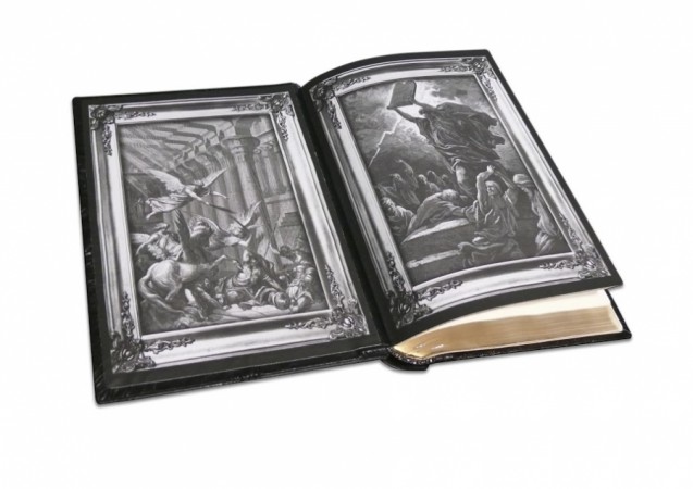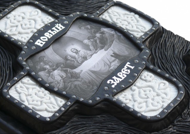 Французька складова палітурка ручної роботи виготовлена з комбінації натуральних шкір (шкіра теля «Vitello nero», овчина «Pelle di pecora delloro» виробництва італійської шкіряної фабрики «Motta Alfredo»). Обкладинка книги дворівнева, оформлена об'ємними візерунками ручного тиснення, рельєфною пом'ятістю шкіри, інкрустацією камінням циркон діамантового огранювання, виробництво компанії «Signity» (діаметр 2,5 мм - кількістю 208 шт., діаметр 3 мм - кількістю 4 шт.). полотні "The Last Supper". Обріз книги поєднав у собі гравіювання та золочення. Обкладинка книги та футляр декоровані срібним тисненням (використано фольгу «Luxor 240»). Подарунковий футляр з натуральної шкіри Mucca Nera виробництва італійської