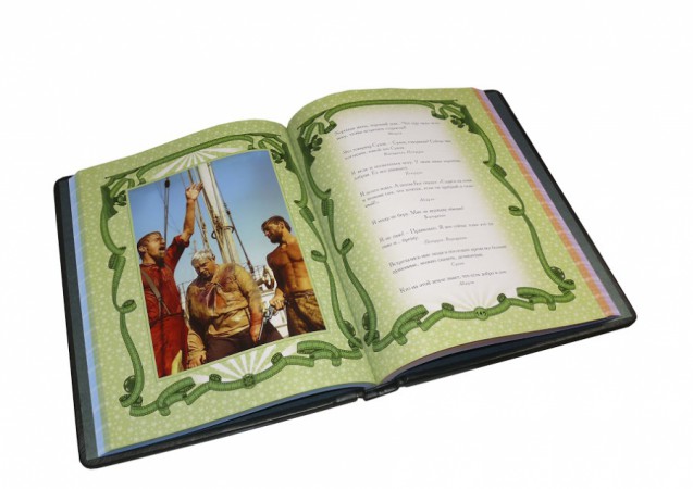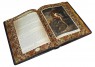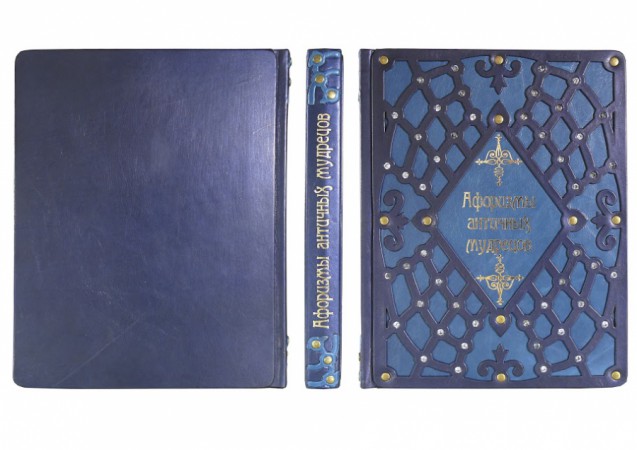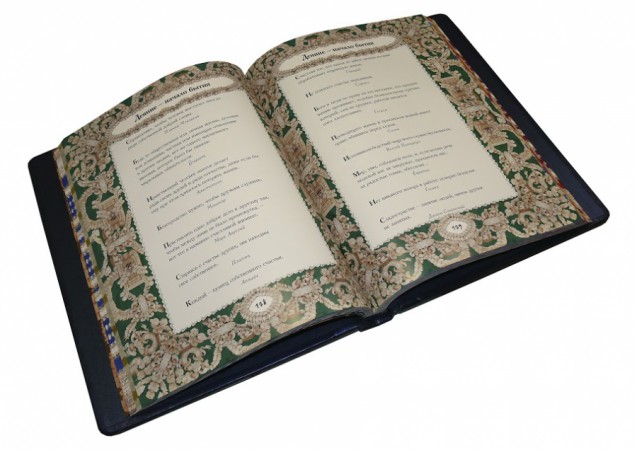 Французька палітурка ручної роботи, виготовлена з комбінації натуральних шкір (шкіра теляча «Gothik Blue», шкіра теляча «Mare onda», виробництва провідних італійських фабрик). Обкладинка книг оформлена об'ємними візерунками ручного затягування в шкіру, з інкрустацією камінням циркон (колір блакить) діамантового огранювання вищого гатунку (виробництво компанії Signity), діаметром 5 мм. (Кількість 48 шт.). Латунні холітени 'Антик' кількістю 18 шт. Тираж 15 номерних екземплярів. Сертифікат У комплекті оксамитовий чохол на блискавці.