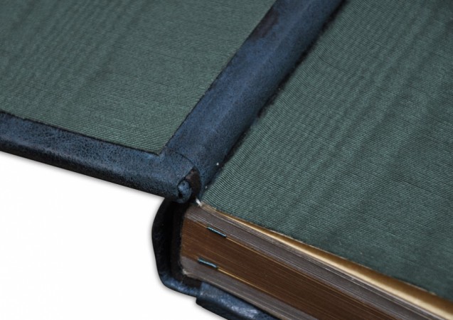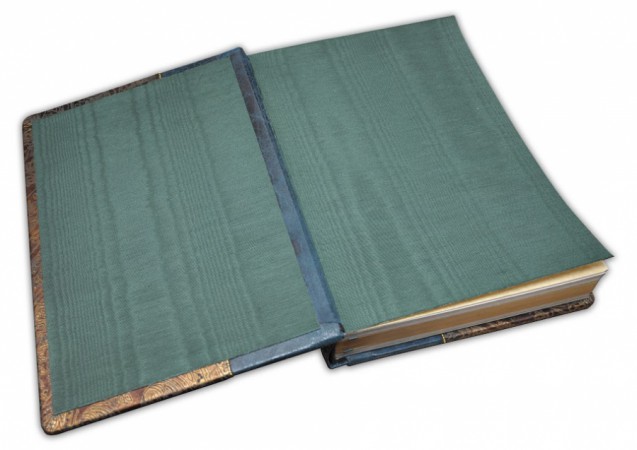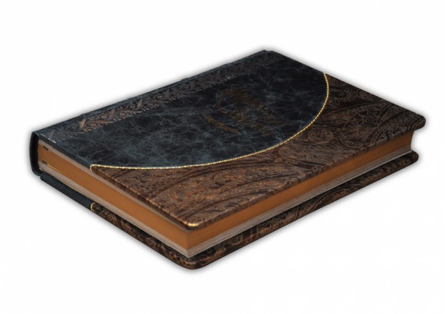 Французька складова палітурка ручної роботи виконана з комбінації натуральної шкіри (шкіра теля «Marmaverde», шкіра «Raccontobronzо») виробництва італійської шкіряної фабрики «Benericetti». Обкладинка книг та подарунковий футляр конструкції «Sustodia» декоровані комбінацією з рельєфного тиснення, із застосуванням срібної та золотої фольги «Luxor 240», вставками з декоративної тасьми. Складовий форзац з шовку муарового на шкіряній слизурі, каптал посилений, вшитий в основу палітурки. Футляр усередині вистелений оксамитом "Marone". Обріз книг двоколірний, полірований та позолочений вручну (комбінації бронзового та срібного кольорів). Коріння оформлені натуральними бинтами. Круглі, збірні кути кришок.