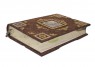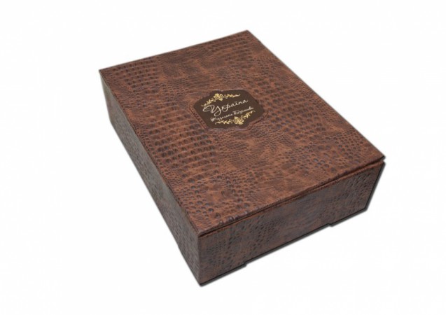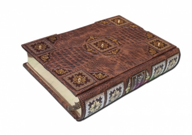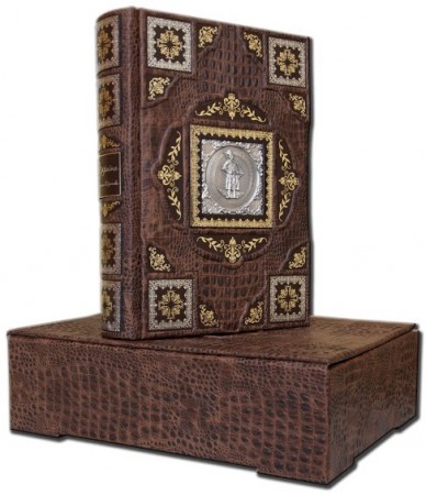 Французька складова палітурка ручної роботи виконана з комбінації натуральних шкір (шкіра «Marrone coccodrillo», шкіра «Robbat Wisky» виробництва італійської шкіряної фабрики «Claudio»). Обкладинка книги оформлена об'ємними візерунками ручного тиснення, композицією із гальванопластики «Козак» із посрібленням. Унікальний подарунковий футляр-підставка, виконаний із тієї ж комбінації шкір, що книга. Обріз книги полірований та пофарбований вручну сусальним золотом.