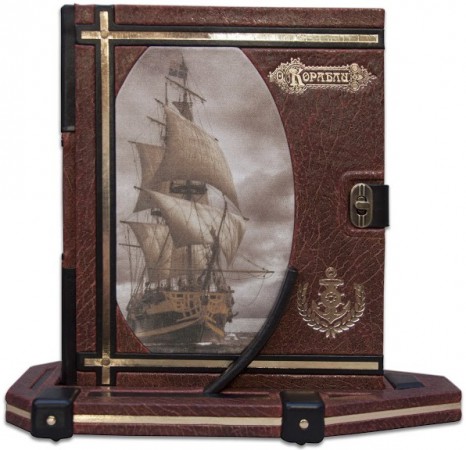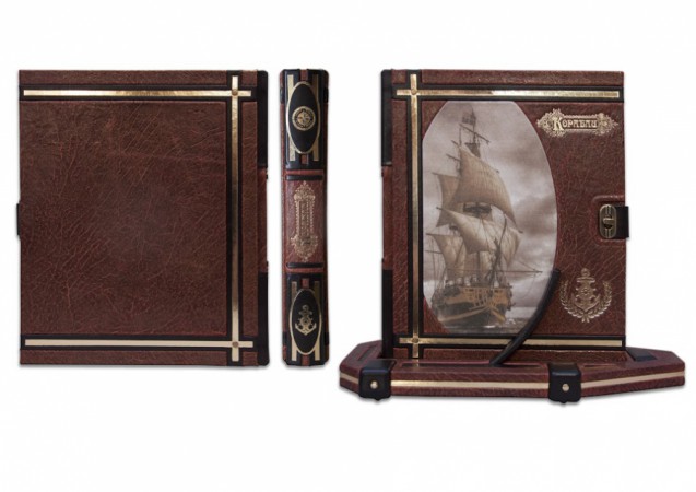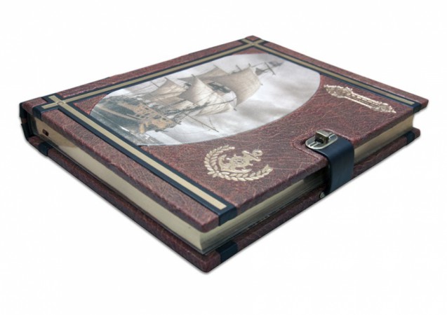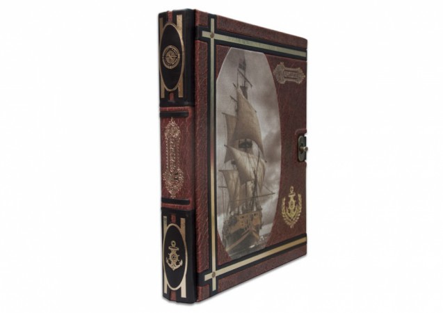 Авторський унікальний дизайн у стилі старовинних каравел. Обкладинка книги вручну виготовлена за традиціями французької складової палітурки. Незвичайний стиль комплекту підкреслено поєднанням двох типів натуральної шкіри («Marone Zegna» та «Jango» виробництва італійської шкіряної фабрики «Carisma») та репродукцією картини на полотні. Двохрівнева обкладинка оформлена рельєфним золотим тисненням, холітенами кольору «Антик» та закривається на декоративний замок. Обріз блоку вручну полірований та позолочений сусальним золотом. Форзац цільний на полотні з репродукціями картин морських баталій. Шкіряний каптал та шовкова стрічка-лясе. Образ книги завершує шкіряна підставка у тому поєднанні матеріалів, як і книга. У комплекті йде оксамитовий чохол, футляр подарунків, іменний сертифікат.