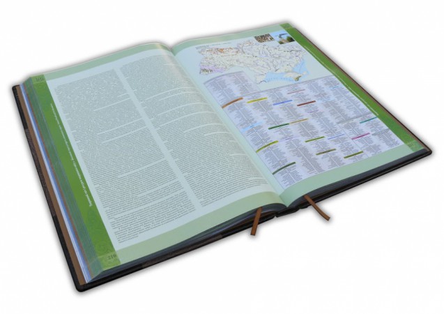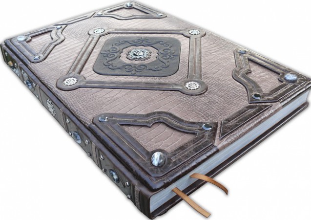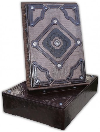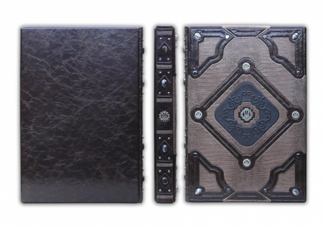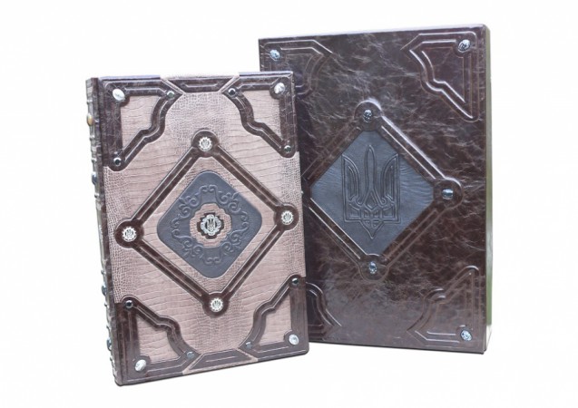Французька складова палітурка ручної роботи та подарунковий футляр-підставка виконані з комбінації натуральних шкір (шкіра «Graft», шкіра Gioia verde, шкіра «Maronne Zegna» виробництва італійської шкіряної фабрики «Benericetti»). Обкладинка книги багаторівнева оформлена об'ємними візерунками ручного тиснення, інкрустована натуральним камінням агат, кількістю 8 штук, камінням циркон діамантового огранювання, кількістю 8 штук, нікелевими холітненами, кількістю 16 штук, срібними тризубцями5. Кришка футляра декорована натуральним камінням «Сніговий обсидіан», кількістю 8 штук. Обріз книги полірований та забарвлений вручну, колір «Silver». Палітурний тираж – 3 унікальні екземпляри. Футляр-підставка вистелений парчою, також у комплекті два парчові чохли (на книгу та футляр) та іменний сертифікат (дані надає клієнт).