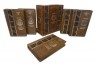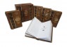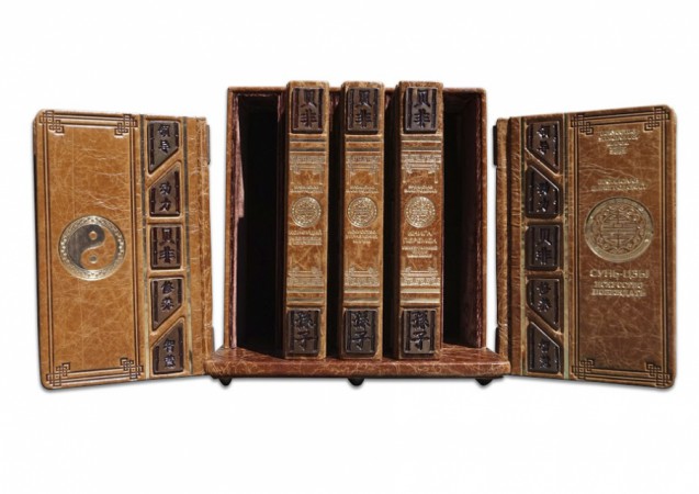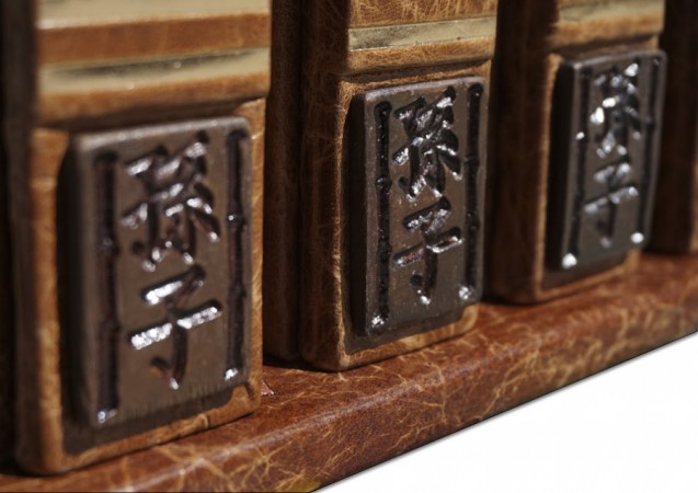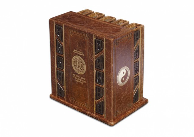 Французька складова палітурка ручної роботи виконана з ексклюзивної шкіри «Vetro marrone vernice» виробництва італійської фабрики «Carisma». Обкладинка книг та подарунковий пенал оформлені багаторівневим тисненням: глибоким блинтовим та рельєфним золотим, а також мідними елементами з карбуванням китайських ієрогліфів. Обріз книг вручну позолочений сусальним золотом та декорований глибоким гравіюванням. Іменний сертифікат, подарунковий чохол.