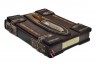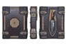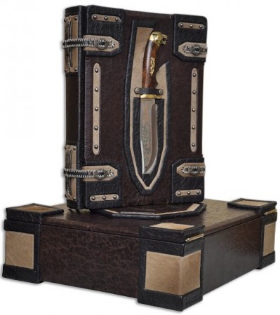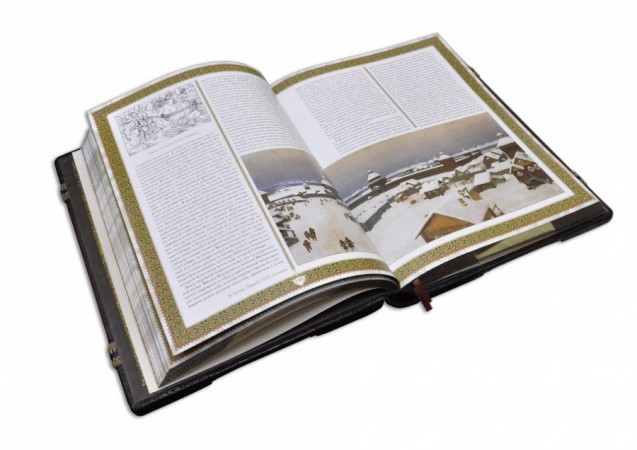 Французька складова палітурка ручної роботи виготовлена з комбінації натуральних шкір (шкіра «Terra di cracking», шкіра «Terra nera», вовна поні «Pezzato» виробництва італійської шкіряної фабрики «Carisma»). Обкладинка книги дворівнева, оформлена латунними холітенами (колір "Антик"), фурнітурою "Ferre", декоративним ножем "Вовк". Обріз книги комбінований, тонований фарбою та позолочений сусальним золотом. Подарунковий футляр-попітюр виготовлений у стилі книги