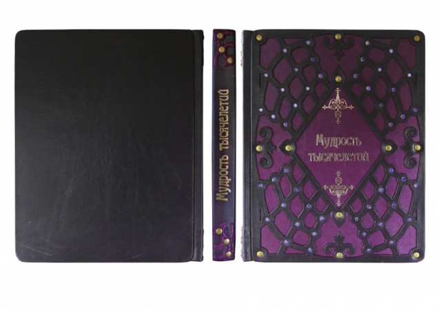 Французька складова палітурка ручної роботи виготовлена з комбінації натуральних шкір (шкіра теляча «Melanzana», шкіра теляча «Mareonda» виробництва італійської шкіряної фабрики «Carisma»). Обкладинка книг оформлена об'ємними візерунками ручного затягування в шкіру, з інкрустацією камінням циркон (колір блакить) діамантового огранювання вищого гатунку (виробництво компанії «Signity»), діаметром 5 мм (кількість 48 шт.). Латунні холітени «Антик», кількістю 18 шт. Обріз блоку вручну полірований та позолочений сусальним золотом.