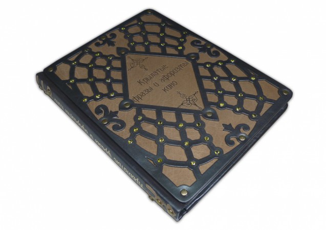 Французька складова палітурка ручної роботи виготовлена з комбінації натуральних шкір (шкіра теляча «Smeraldo», шкіра теляча «Caramel» виробництва італійської шкіряної фабрики «Carisma»). Обкладинка книги оформлена об'ємними візерунками ручного затягування в шкіру, з інкрустацією камінням циркон (колір олива) діамантового огранювання вищого ґатунку (виробництво компанії «Signity»), діаметром 5 мм (кількість 48 шт.), латунними холітенами «Антик», кількістю шт. Обріз блоку вручну полірований та позолочений сусальним золотом.