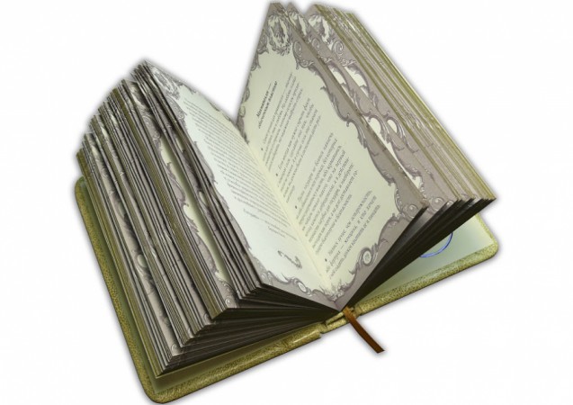 Французька складова палітурка ручної роботи виконана з натуральної шкіри «Marma Parle» виробництва шкіряної італійської фабрики «Claudio». Обкладинка книги оформлена багаторівневим тисненням: глибоким блінтовим та рельєфним золотим, із використанням золотої фольги «Luxor 240». Обріз полірований та забарвлений вручну, колір «Bronze».