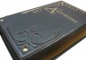 Французька складова палітурка ручної роботи, виконана з натуральної шкіри теля «Smeraldo» виробництва італійської шкіряної фабрики «Motta Alfredo». Обкладинка книги оформлена об'ємними візерунками ручного тиснення, рельєфним золотим тисненням із використанням золотої фольги «Luxor 240», латунними холітенами (колір «Gold»), кількістю 4 шт., обріз книги полірований та пофарбований вручну, колір «Bronze».